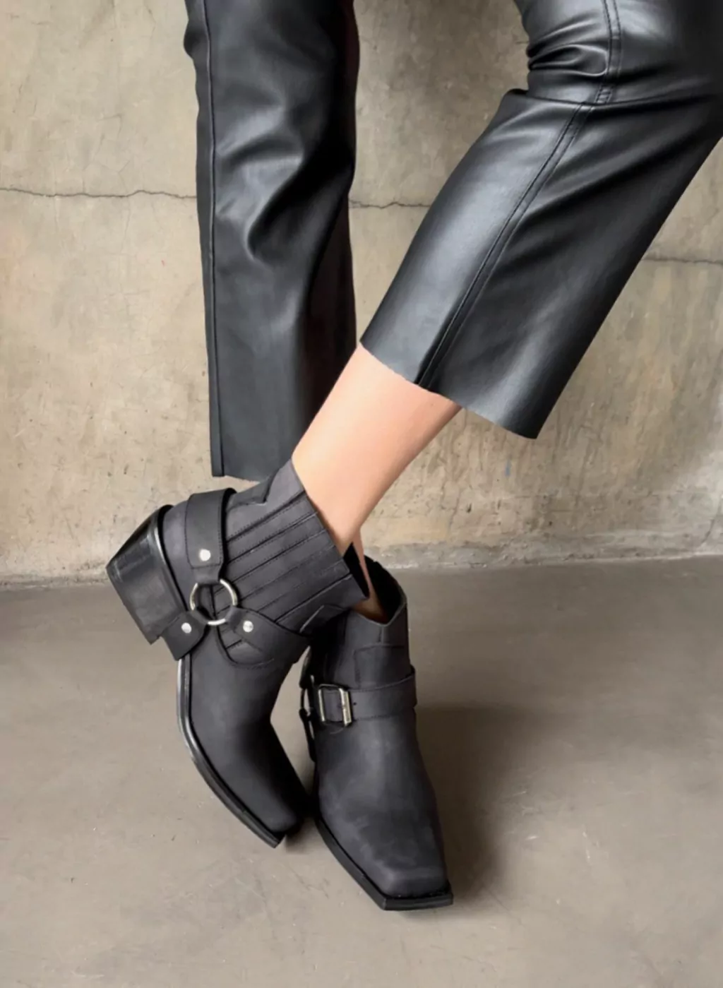 Botas de horma cuadrada confeccionadas en cuero vacuno engrasado. Forro vacuno.