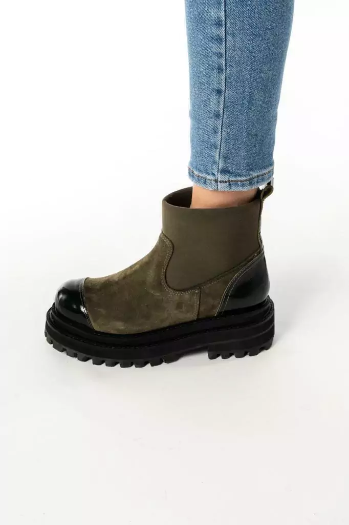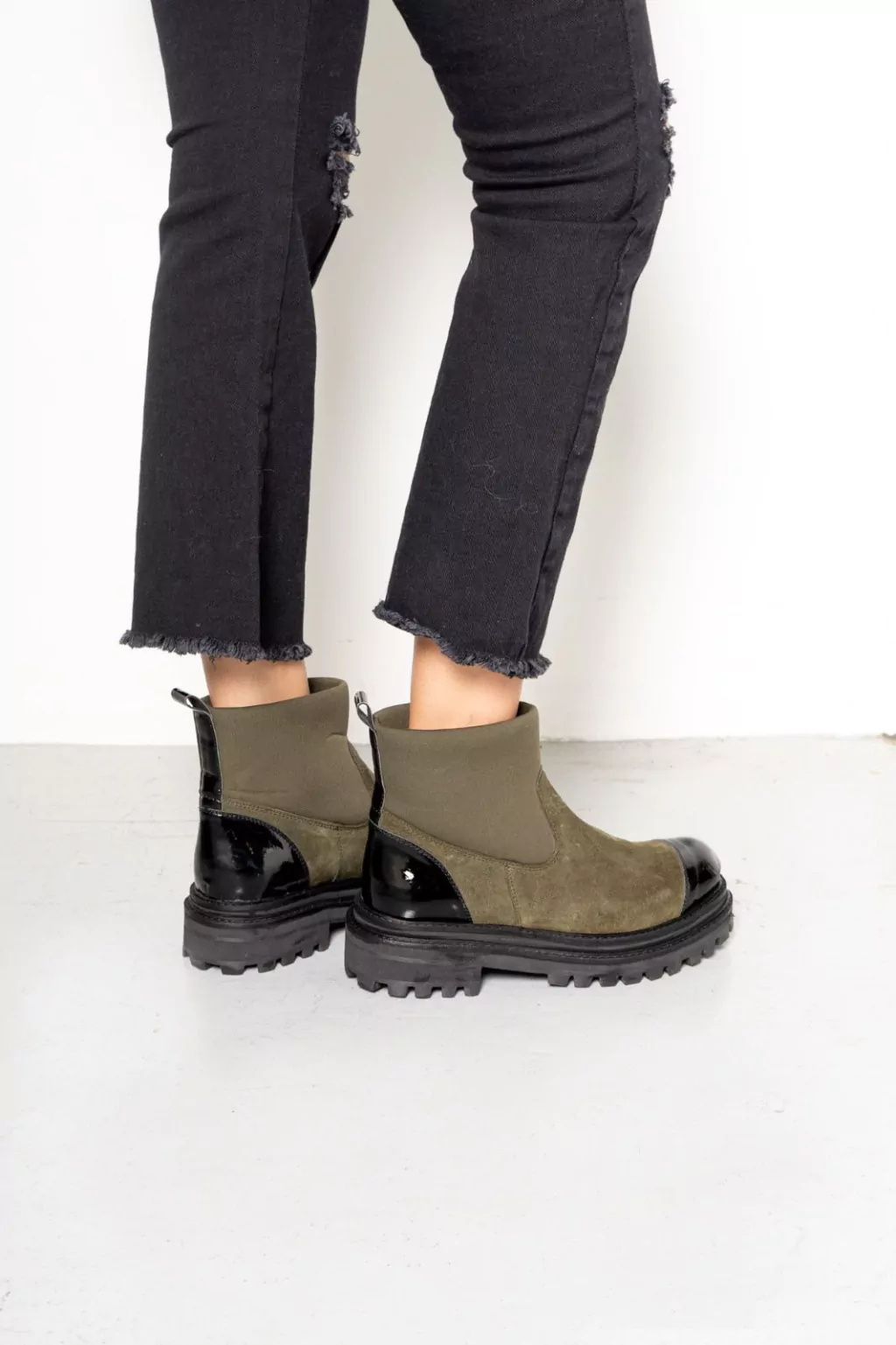 Botas confeccionadas en cuero vacuno gamuzado combinado con neoprene y charol negro.